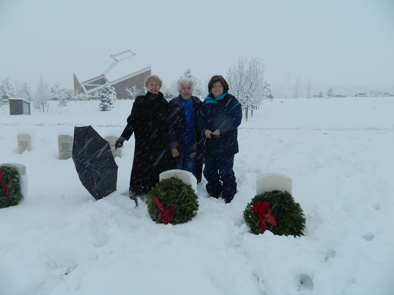 Dec. 15, 2012, found a few of us participating in “Wreaths Across America” at the Veterans Memorial Cemetery, Camp Williams. We met in the chapel for a ceremonial meeting prior to laying the wreaths. Afterwards, Pat Moseman, State Chairman Project Patriot, and Janis McCoid, Honorary State Regent, and I braved the winter storm that day as we ventured outside to lay wreaths on Veteran’s graves in a foot of snow.